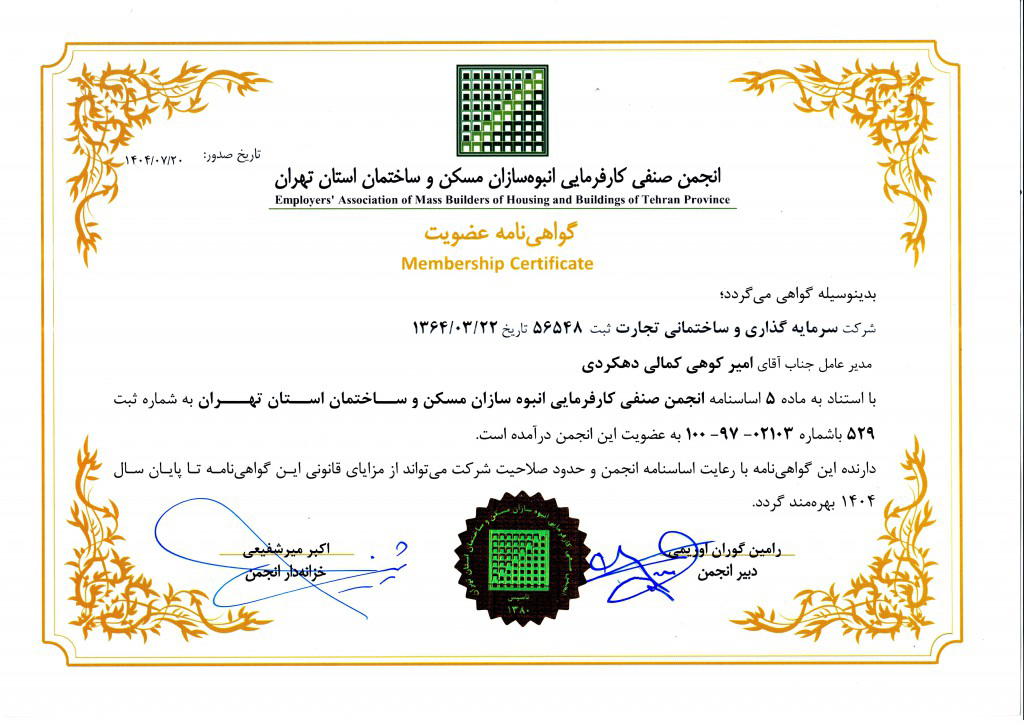 پس از موفقیت شرکت در کسب عضویت حقوقی سازمان نظام مهندسی ساختمان استان تهران، این شرکت اکنون با دریافت گواهی عضویت انجمن صنفی کارفرمایی انبوهسازان مسکن و ساختمان استان تهران، گامی دیگر در مسیر ارتقای جایگاه تخصصی و حرفهای خود برداشته است.